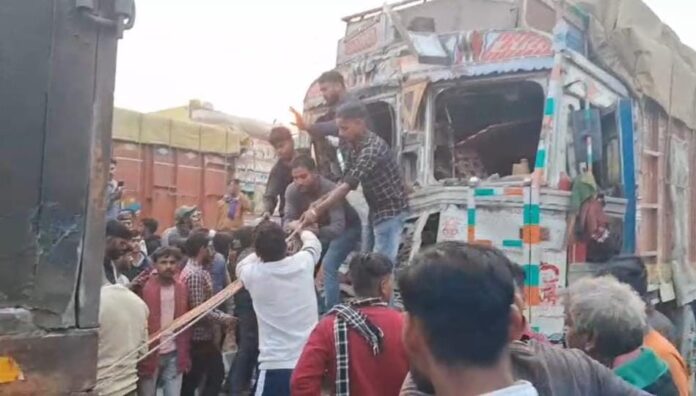 Bihar, कैमूर (भभुआ): कैमूर जिले के मोहनिया थाना क्षेत्र अंतर्गत दिल्ली–कोलकाता हाईवे पर शारदा प्रसाद हाई स्कूल के समीप गुरुवार को एक भीषण सड़क हादसा हो गया। एक ट्रक के अचानक ब्रेक लगाने से पीछे से आ रहे दो अन्य ट्रक आपस में टकरा गए, जिससे तीन ट्रकों की जोरदार टक्कर हो गई। हादसे में दो ट्रक चालक केबिन में फंस गए और गंभीर रूप से घायल हो गए।