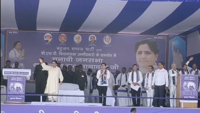 Bihar, भभुआ: भभुआ शहर के हवाई अड्डा मैदान में आयोजित चुनावी सभा में बसपा प्रमुख बहन मायावती ने जोरदार हुंकार भरा। जनसभा में हजारों लोगों की ऐतिहासिक भीड़ उमड़ी, पूरे मैदान में “जय भीम, जय बसपा, जय मायावती” के नारे गूंजते रहे। कार्यक्रम स्थल पर भारी संख्या में पुलिस बल, मजिस्ट्रेट और प्रशासनिक अधिकारी तैनात रहे।