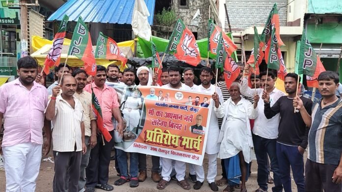Bihar: कैमूर जिले की चैनपुर विधानसभा अंतर्गत हाटा नगर में रविवार को भाजपा कार्यकर्ताओं और स्थानीय ग्रामीणों ने प्रतिरोध मार्च निकाला। यह मार्च प्रधानमंत्री नरेंद्र मोदी की दिवंगत माता जी के खिलाफ महागठबंधन के मंच से अभद्र टिप्पणी किए जाने के विरोध में आयोजित किया गया।