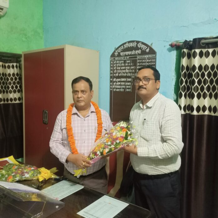 Bihar: कैमूर जिले के चैनपुर प्रखंड अंचल कार्यालय में सोमवार की दोपहर नव पदस्थापित अंचल अधिकारी (सीओ) अनिल प्रसाद सिंह ने पदभार ग्रहण किया। इस अवसर पर प्रभारी सीओ बब्बन पाल ने उन्हें फूलों का गुलदस्ता देकर स्वागत किया।