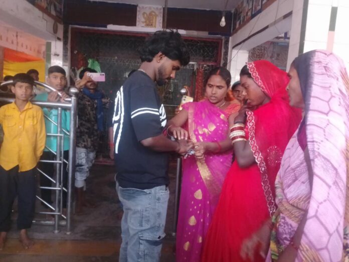 फिर क्या था, मौके पर ही “चट मंगनी पट ब्याह” की तर्ज पर विवाह की तैयारी कर दी गई। थाना के सामने स्थित मां दुर्गा मंदिर में स्थानीय लोगों और दोनों परिवारों की मौजूदगी में युवक-युवती ने एक-दूसरे को वरमाला पहनाई। इसके बाद युवक ने युवती की मांग में सिंदूर भरकर विधिवत विवाह की रस्म पूरी की। अचानक हुए इस विवाह को देखने के लिए मंदिर परिसर में बड़ी संख्या में लोग जुट गए और पूरे क्षेत्र में यह शादी चर्चा का विषय बनी रही।
