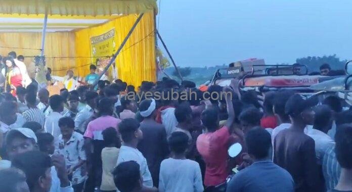 झगड़े के बीच एक युवक ने गुस्से में हेलमेट उठाकर दूसरे पर हमला करने की कोशिश की। यह नजारा देखते ही आसपास अफरा-तफरी मच गई। लोग भागने लगे और थोड़ी देर के लिए सभा स्थल पर भगदड़ जैसी स्थिति बन गई।