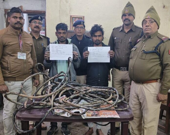 Bihar, कैमूर: मोहनिया थाना क्षेत्र अंतर्गत मुठानी रेलवे स्टेशन पर रेलवे की सिग्नलिंग केबल चोरी करते हुए आरपीएफ भभुआ एवं सीआईबी डीडीयू की संयुक्त टीम ने दो युवकों को रंगे हाथ गिरफ्तार किया है। यह कार्रवाई मंगलवार 13 जनवरी 2026 को सुबह करीब 10:40 बजे की गई।