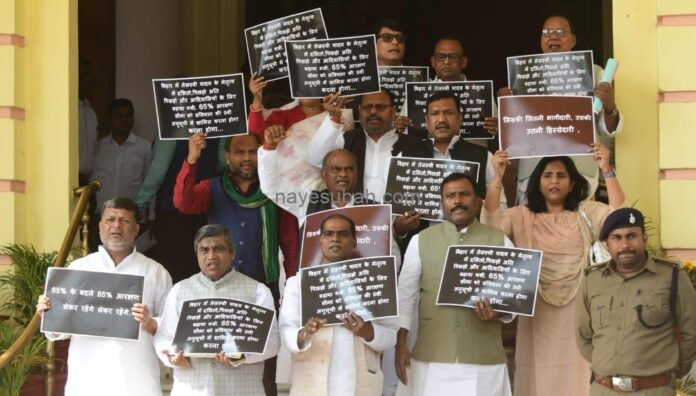 Bihar, पटना: आरक्षण के मुद्दे पर बिहार की सियासत एक बार फिर गरमा गई है। बुधवार को विधानसभा परिसर में राष्ट्रीय जनता दल (राजद) के नेताओं और विधायकों ने जोरदार प्रदर्शन कर आरक्षण की सीमा 85 प्रतिशत करने की मांग उठाई।