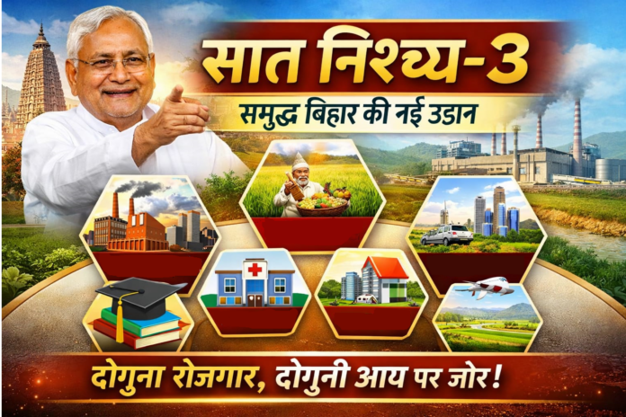 Bihar, पटना: मुख्यमंत्री नीतीश कुमार की अध्यक्षता में मंगलवार को हुई राज्य मंत्रिमंडल की अहम बैठक में ‘सात निश्चय-3’ को मंजूरी दे दी गई। सात निश्चय-1 और सात निश्चय-2 के बाद अब सरकार ने अगले पाँच वर्षों के लिए विकास का नया एजेंडा तय किया है। इसका उद्देश्य न्याय के साथ विकास की अवधारणा को आगे बढ़ाते हुए बिहार को देश के सर्वाधिक विकसित राज्यों की श्रेणी में शामिल करना है।