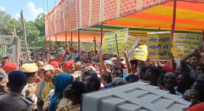 Bihar, भागलपुर: मुख्यमंत्री नीतीश कुमार के भागलपुर जिले के कहलगांव अनुमंडल अंतर्गत सिलहन खजुरिया पंचायत में आयोजित कार्यकर्ता संवाद कार्यक्रम के दौरान शिक्षक अभ्यर्थियों ने जमकर विरोध प्रदर्शन किया। सभा के बीचों-बीच अभ्यर्थियों ने ‘सीट नहीं बढ़ेगी तो वोट नहीं’ के नारे लगाए और हाथों में तख्तियां लहराकर अपनी मांग रखी।
