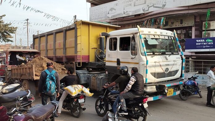 स्थानीय लोगों के अनुसार भारत माला परियोजना के तहत बन रही सड़क के लिए मोरम सप्लाई करने वाले डंपर 24 घंटे बाजार से गुजर रहे हैं। एक साथ 8 से 10 डंपर बाजार में प्रवेश कर जाते हैं, जिससे जाम की स्थिति और गंभीर हो जाती है। वहीं, ई-रिक्शा और अन्य वाहनों की अव्यवस्थित पार्किंग भी समस्या को बढ़ा रही है।